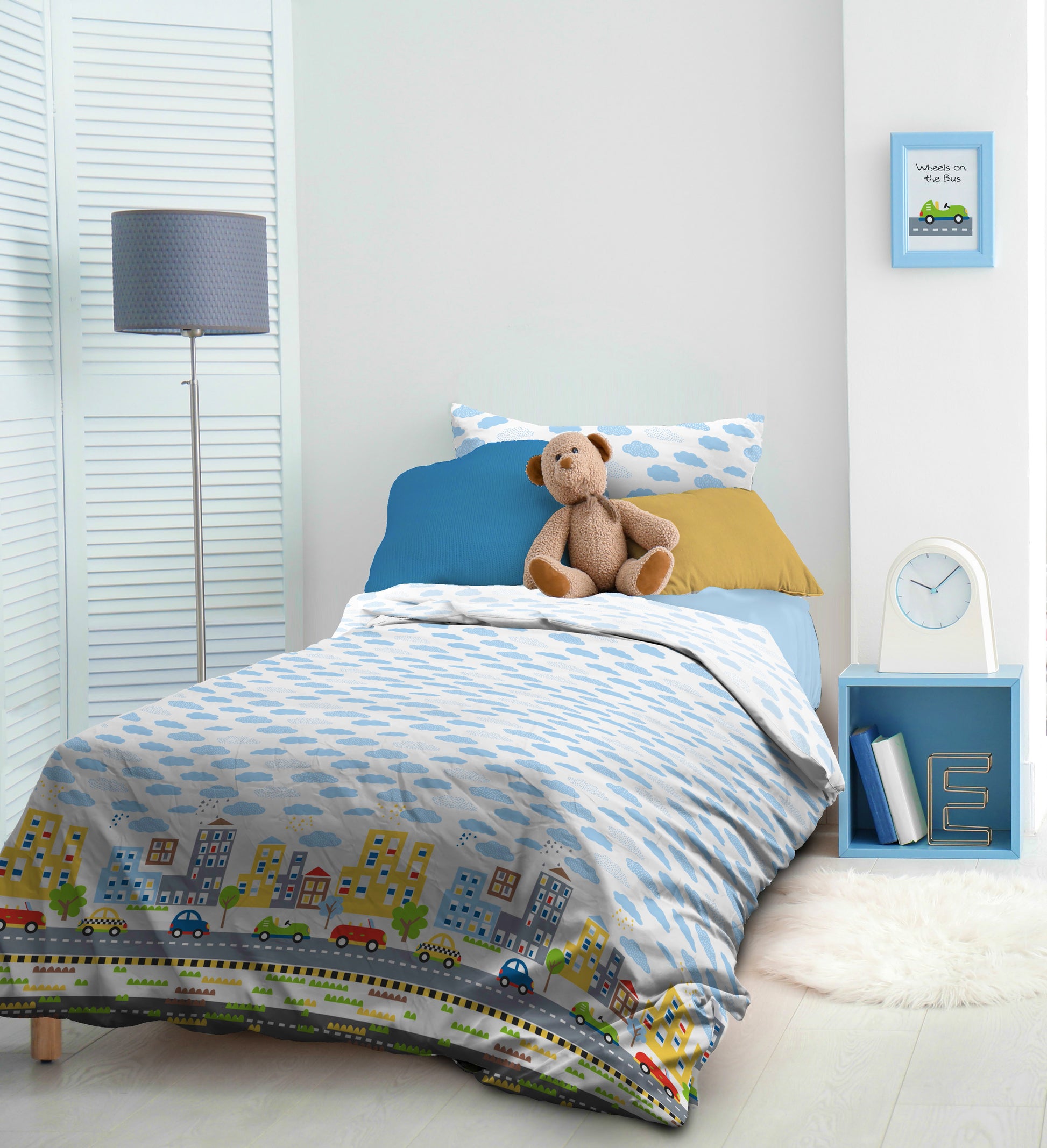 • Brighten your day with this charming and vibrant duvet cover featuring cars & buildings design.  This fun set is sure to add a playful update to your child’s bedroom.